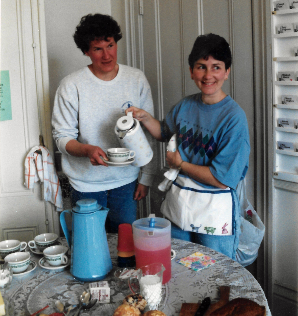 Right: Carol Chaffee and Jane O'Connell serve coffee and sell baked goods, in the narthex, at the annual WGF spring rummage sale on April 20, 1996.
