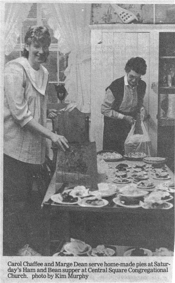 Left: Carol Chaffee and Marge Dean, (circa 1986) serve pie at a Ham and Bean Supper at CSCC. The church hosted about 4 ham and bean suppers annually with great success, thanks to the leadership of David Moore. Marge and Jim Dean were active members of our congregation, Jim was known for his woodworking skills, selling his wares at the church fair, and Marge was active in the Women’s Fellowship. Both were fun loving and faithful to our church.