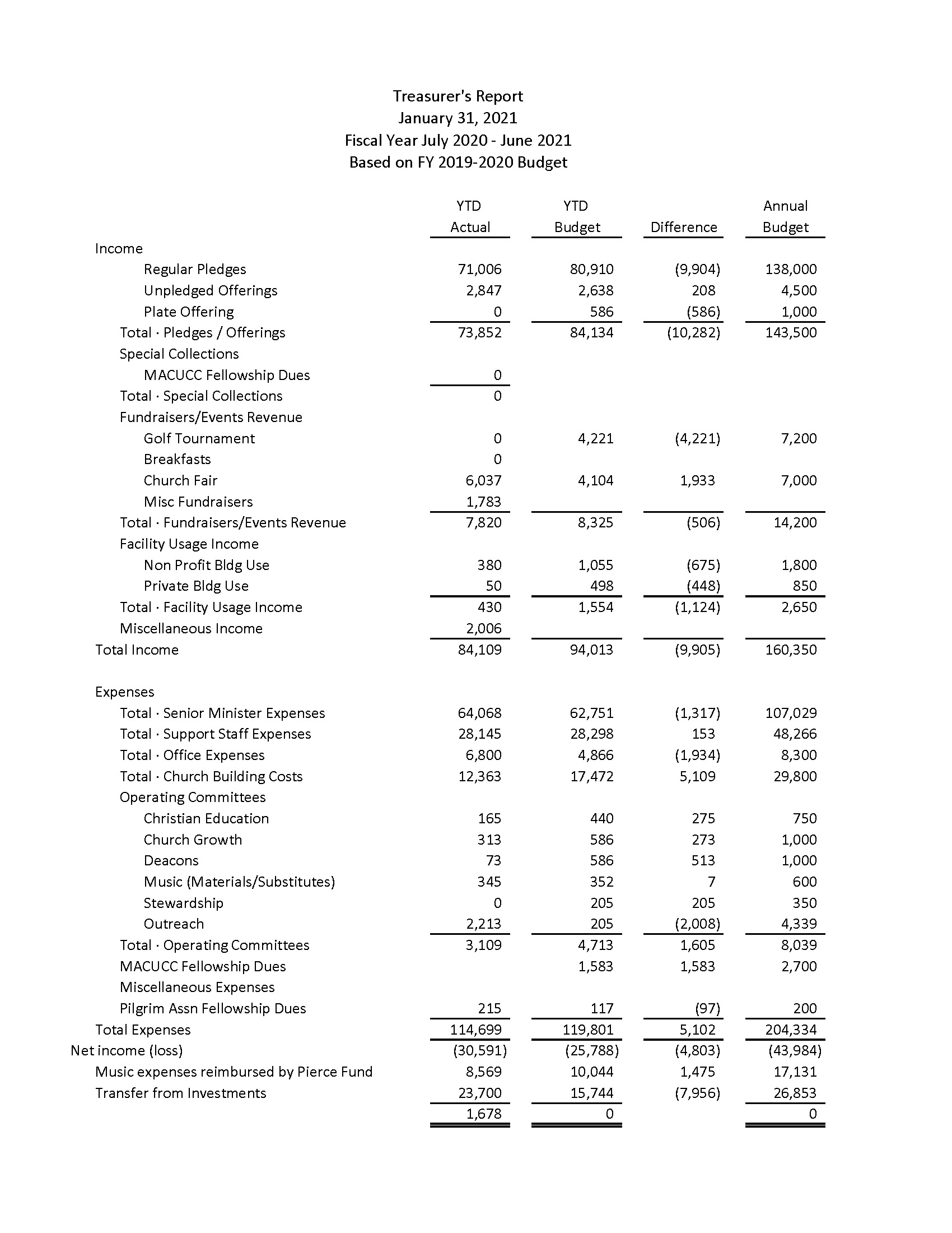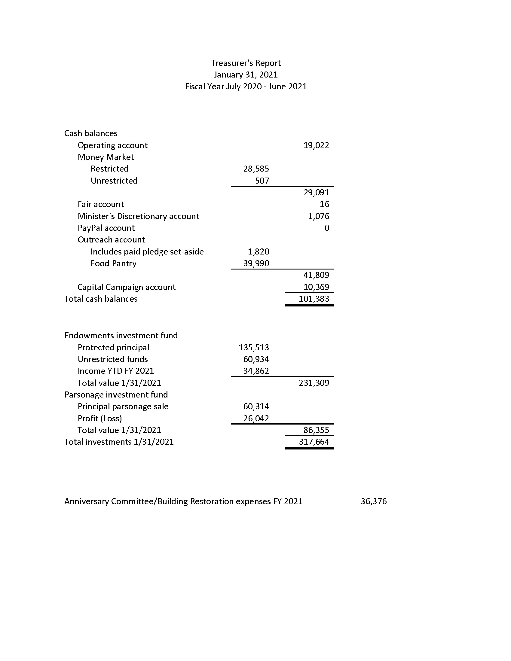 2020 calendar year-end statements will not be mailed to everyone to save paper and postage, but can be requested from the church office. Dave will ask Judy to email out statements to anyone for whom we have email an email address on file. Following discussion, it was decided that paper fiscal year-to-date statements will be generated in mid-March and mailed with a cover letter asking folks to make sure they’re up to date on their pledges. Rev. Beth, Gail Wershing, and Dave will work on this project of crafting a letter and getting the mailing out.