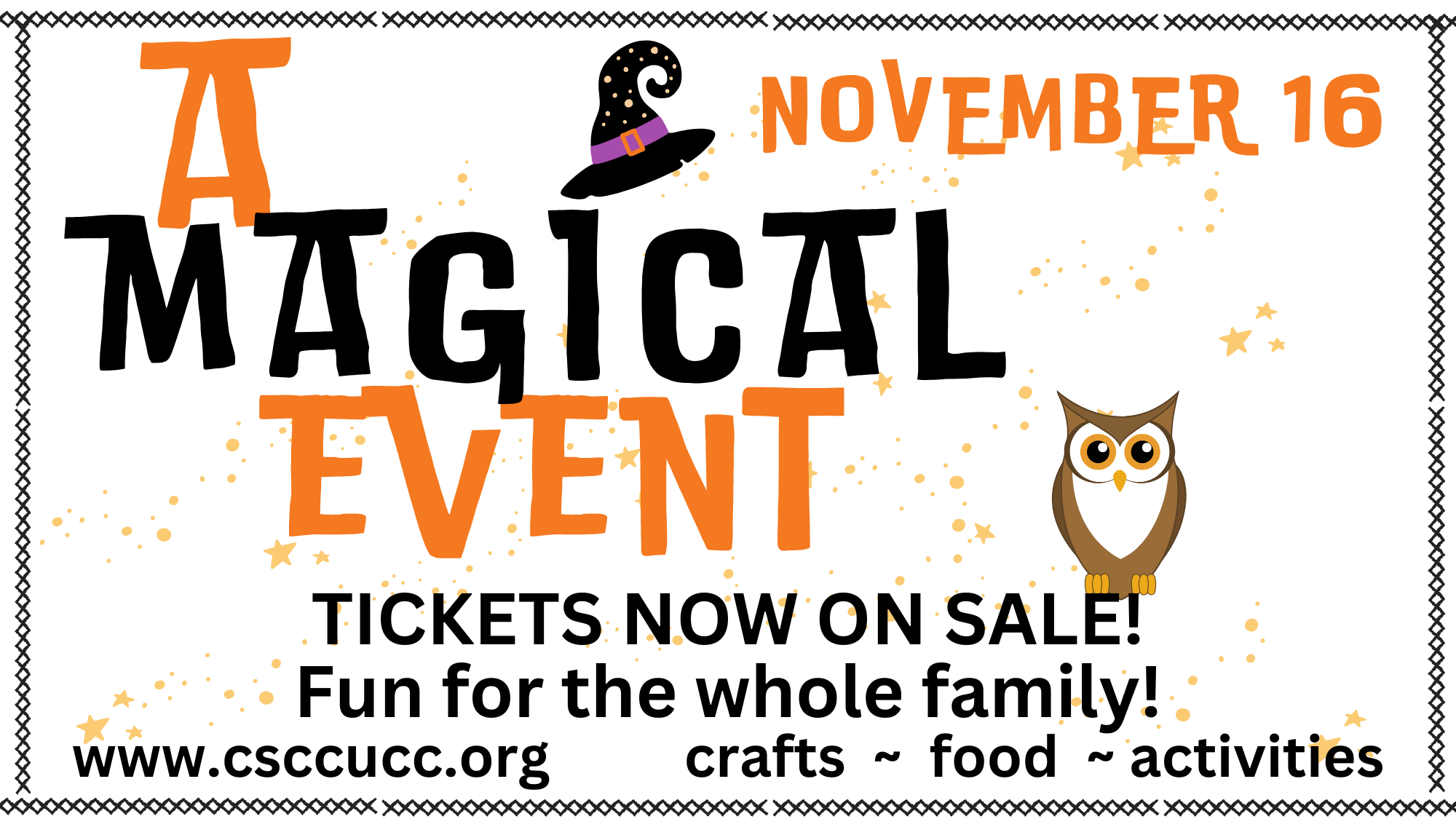 Bats and cats and all kinds of critters will be there. Grab your brooms and be ready to fly to Central Square Congregational Church— the doors open at 3:00 on Saturday, November 16th. Tell all your friends! There will be food, fun, crafts, a scavenger hunt, and of course... magic will be in the air!