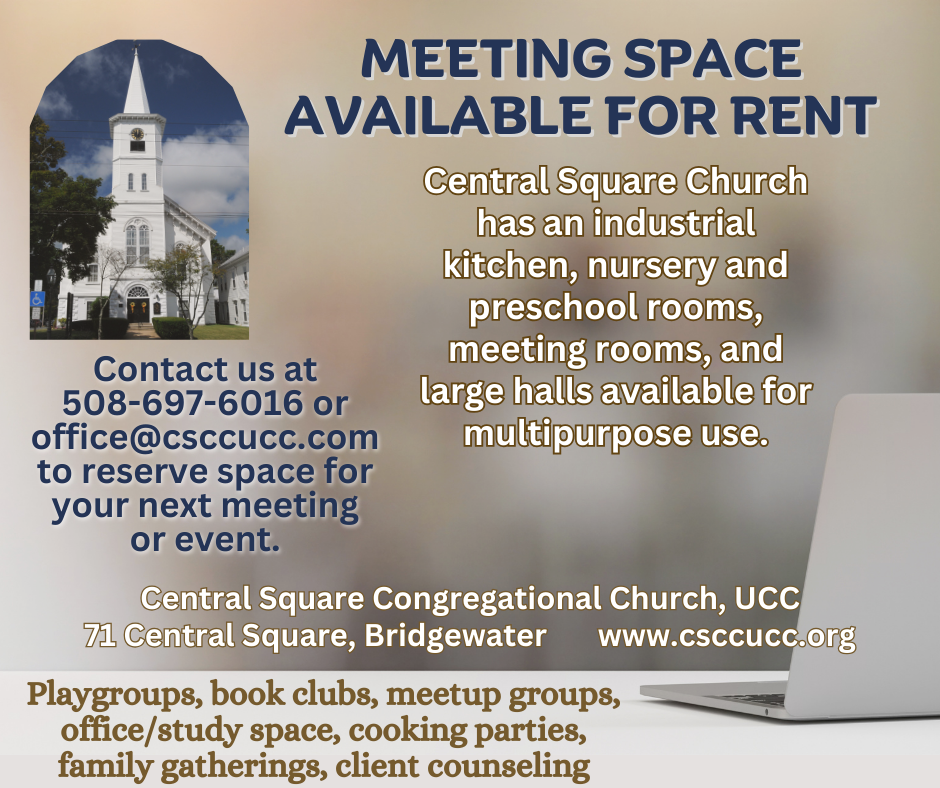 If you are interested in possibly renting one or more of our available spaces, contact the church office at office@csccucc.com or 508-697-6016 for availability. (Office hours are shown on the website home page.)