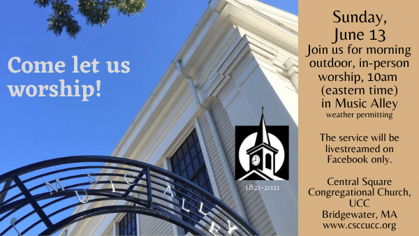 Weather permitting, our worship service on this day will be held in-person, outdoors, in Bridgewater's Music Alley (in the center of town). Some chairs will be provided, or feel free to bring your own. Social distancing and masking will be respected. The service will be livestreamed on Facebook only.