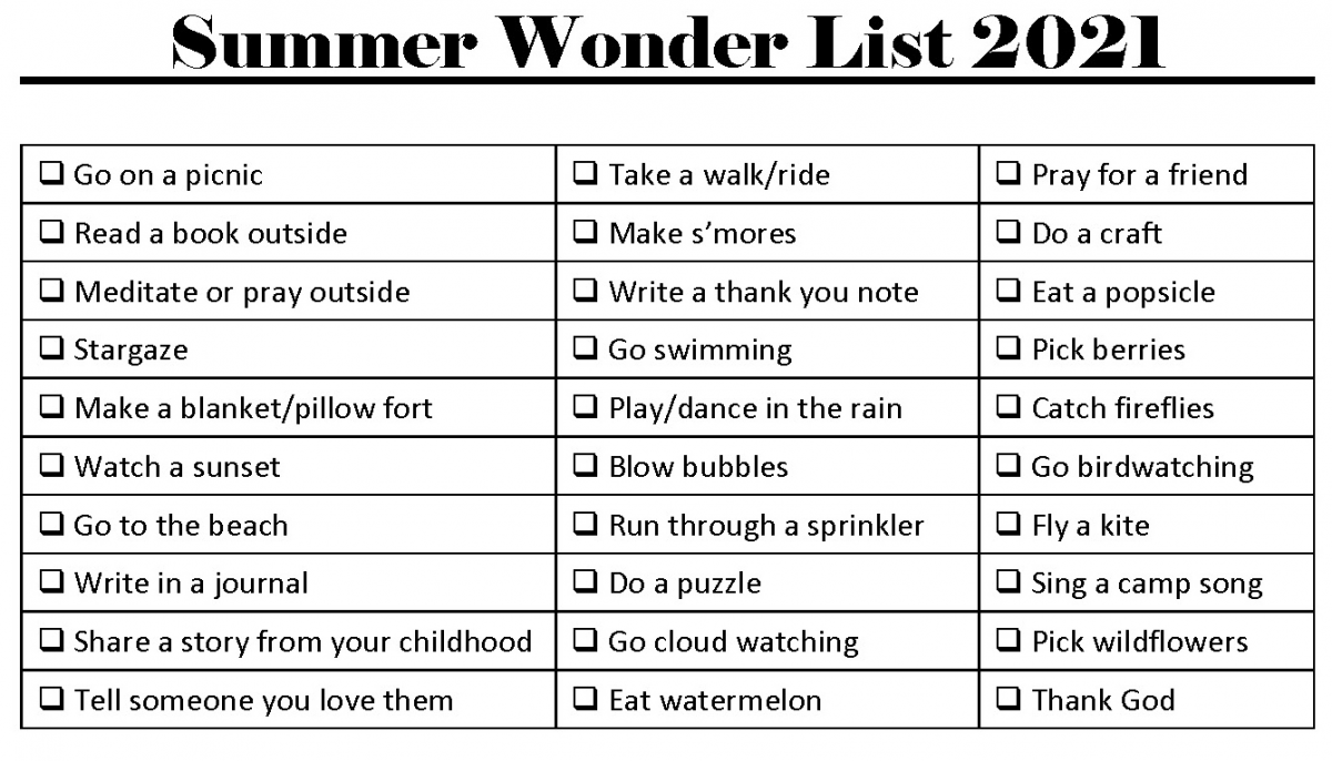 It’s got me wondering… as we grow up, do we forget to live into the magic and wonder of summer? Instead of a Summer Reading Card, would you like a Summer Wonder List? (Sorry, I can’t give you a personal pan pizza at the end of the summer.) If you’re interested, here’s a list of “Wonder”-full things you can do and experience this summer.  No matter how you spend your summer, I hope you’ll take some time each day to stop, to breathe in and out, and give thanks to God for this one “wild and precious life”.