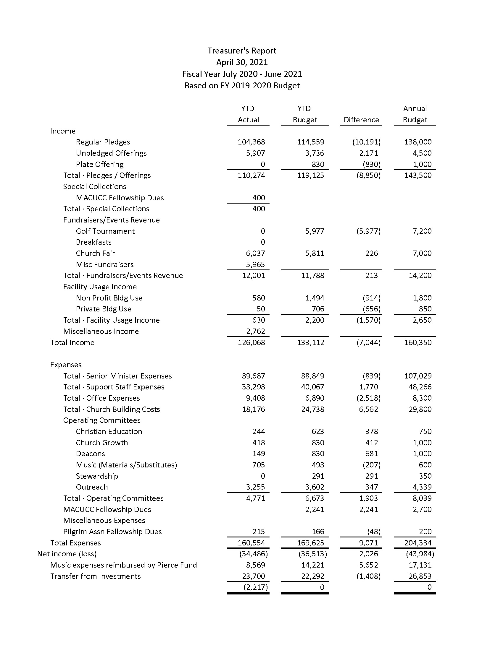 Dave reviewed the proposed budget. He noted that it is very much the same as last year’s budget with a few notable exceptions: (1) there is a 3% increase in Rev. Beth’s package; (2) a “miscellaneous fundraisers” line item for $5,000 was added, based on what we have been able to do this past year; (3) the golf tournament is still included, and we should be serious about making sure we hold it as it is a big line item in the revenue section. Dave noted that there are various people willing to do specific tasks associated with the tournament, but without a coordinator, it won’t happen, and it needs to. Even if it’s later this summer into the next fiscal year, like August or September.