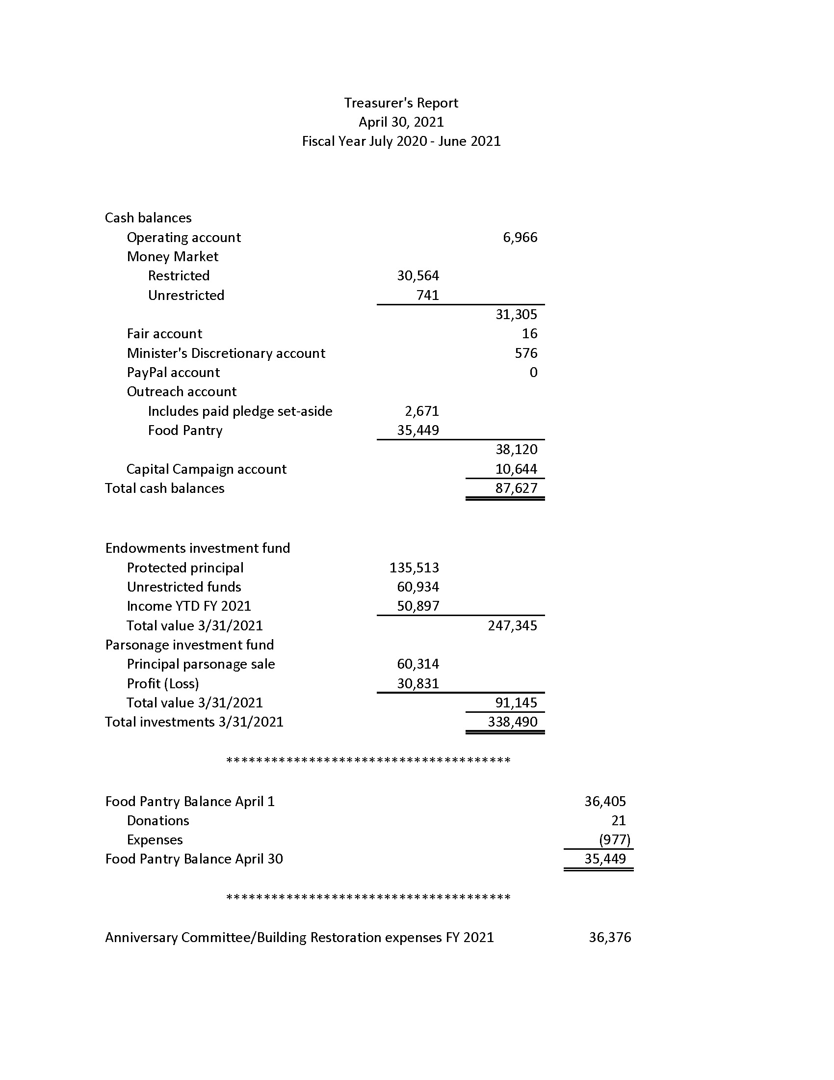 The bottom line in the budget is similar to last year, and still calls for up to $42,000 withdrawal from the endowments as well as $17,500 from the Johnson Fund to absorb our music expenses. If the stock market continues to do well, it will help with not depleting our endowments when we need to make withdrawals.