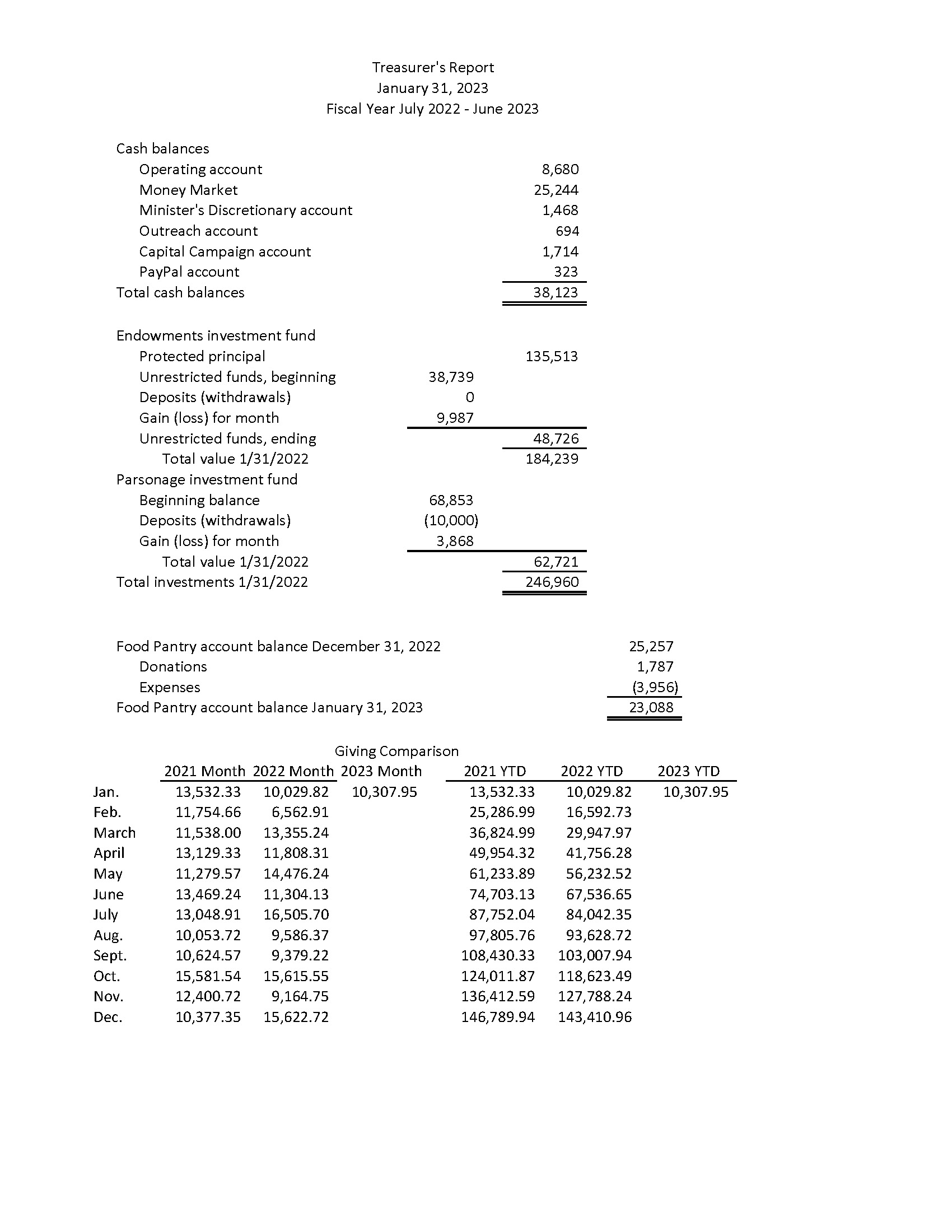 Bill noted that the Board of Outreach on behalf of CSCC donated money to the Heifer project and Blanket Sunday, and will be making a donation to earthquake relief for Turkey and Syria.