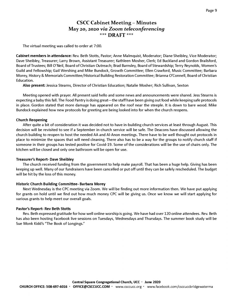 As this pandemic continues to affect our community and our world, and with the least among us particularly in mind, the Central Square Congregational Church building, at the recommendation of the Southern New England Conference, the CSCC Board of Deacons, and the CSCC Cabinet, has extended its closure until at least September 1.