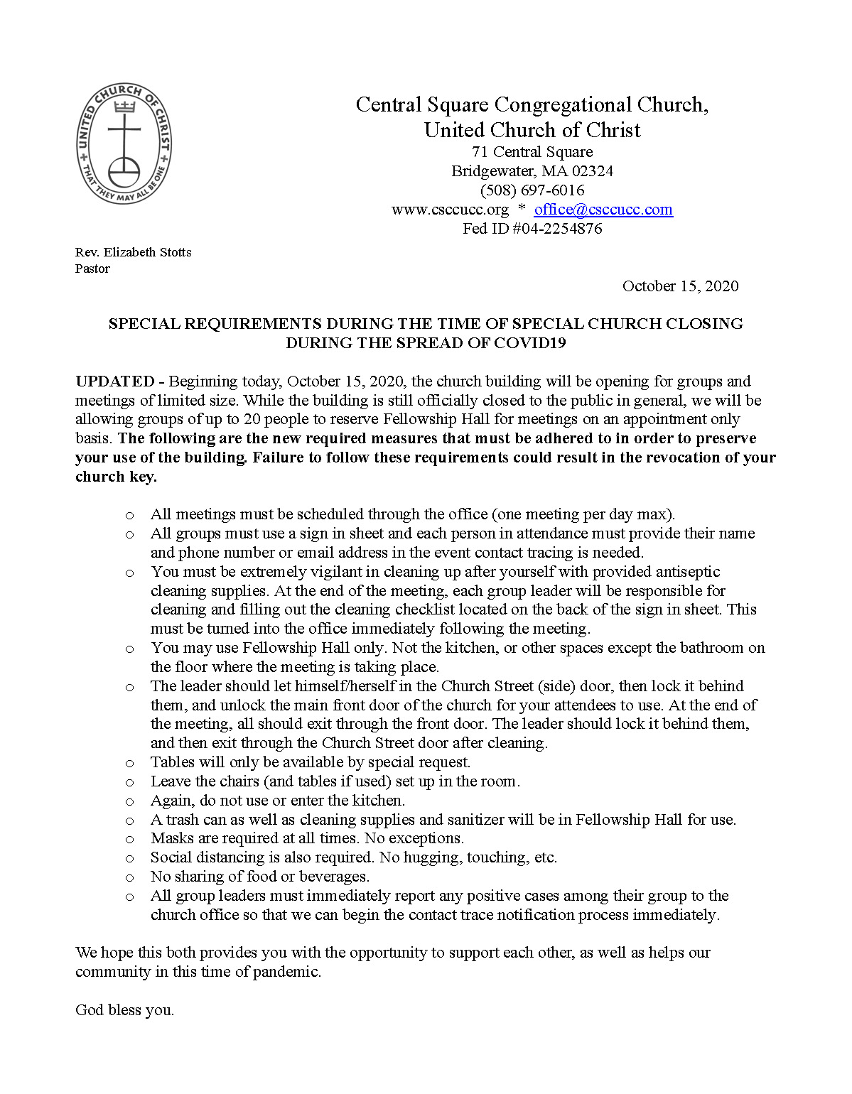 • Even if you have a key to the building, please do not enter the building during this time unless you are part of a pre-approved building use group, at the time of the approved use. Each one of us that enters is a potential carrier, even if we’re not feeling sick. If you are tempted to say, "well, I'm sure that doesn't mean me.", IT DOES. If you have any questions or think that you should enter the building for any reason, call the church office at 508-697-6016 (phone is being answered remotely during the shutdown) or send an email to office @ csccucc.com.