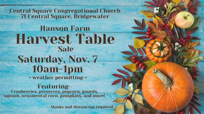 · Pie sale, craft sale, Hanson Farm harvest table (all outdoors) on Saturday, Nov. 7, weather permitting.