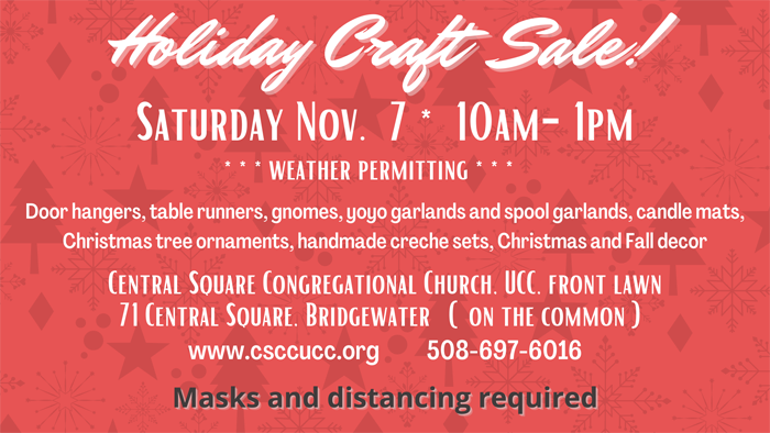 On Saturday, November 7th between 10am and 1pm look for the Holiday church fair crafters on the front lawn of our church. In case of rain join us on Sunday, November 8th following church until 2pm. You will have an opportunity to shop for your fall and Christmas needs and run into some of your church friends you have not seen in a while. We do ask you to wear a facemask and to follow safe distancing.