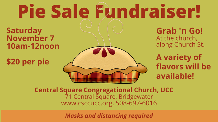Grab ‘n Go! Come by the side door of the church (on Church St.), and pick up a delicious, homemade pie. Flavor availability will be first come, first serve. Will you take an apple pie home? How about pumpkin? Maybe one of each?
