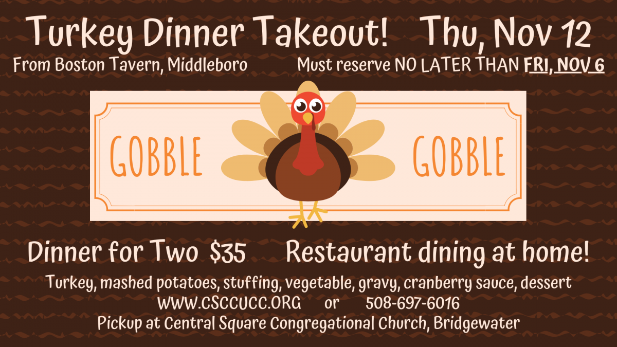 · Turkey Dinner Takeout, catered by Boston Tavern in Middleboro, on Thursday, Nov. 12. Preorders are required. Preordering deadline is Friday, Nov. 6.