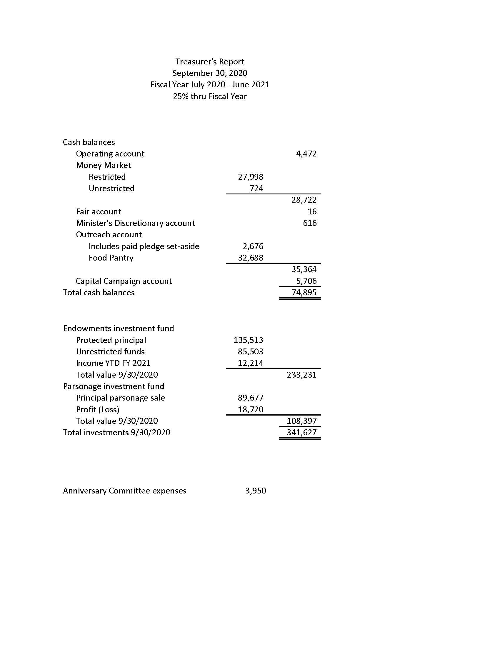 · Rich Sullivan (sexton) noted that he has not had to order cleaning supplies in quite some time, but is nearing the time he needs to do so, especially with the building opening up to small group meetings. He will keep the expense as low as he can.