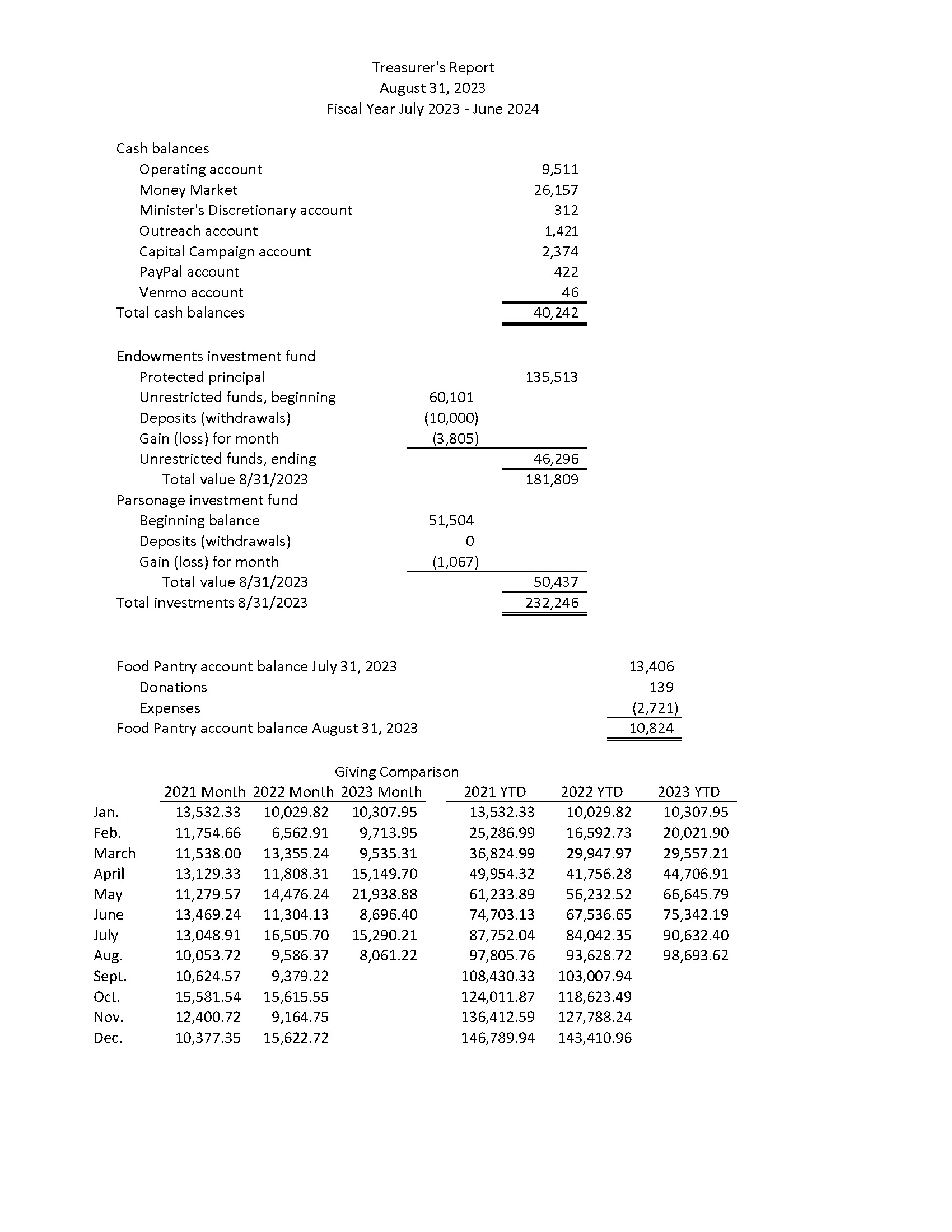 Rev. Beth noted that she recently used up the last of the funds in the Minister’s Emergency Fund, so we should do a plug for people to donate. The food pantry report also noted that they are lower in funds than they have been in a while.