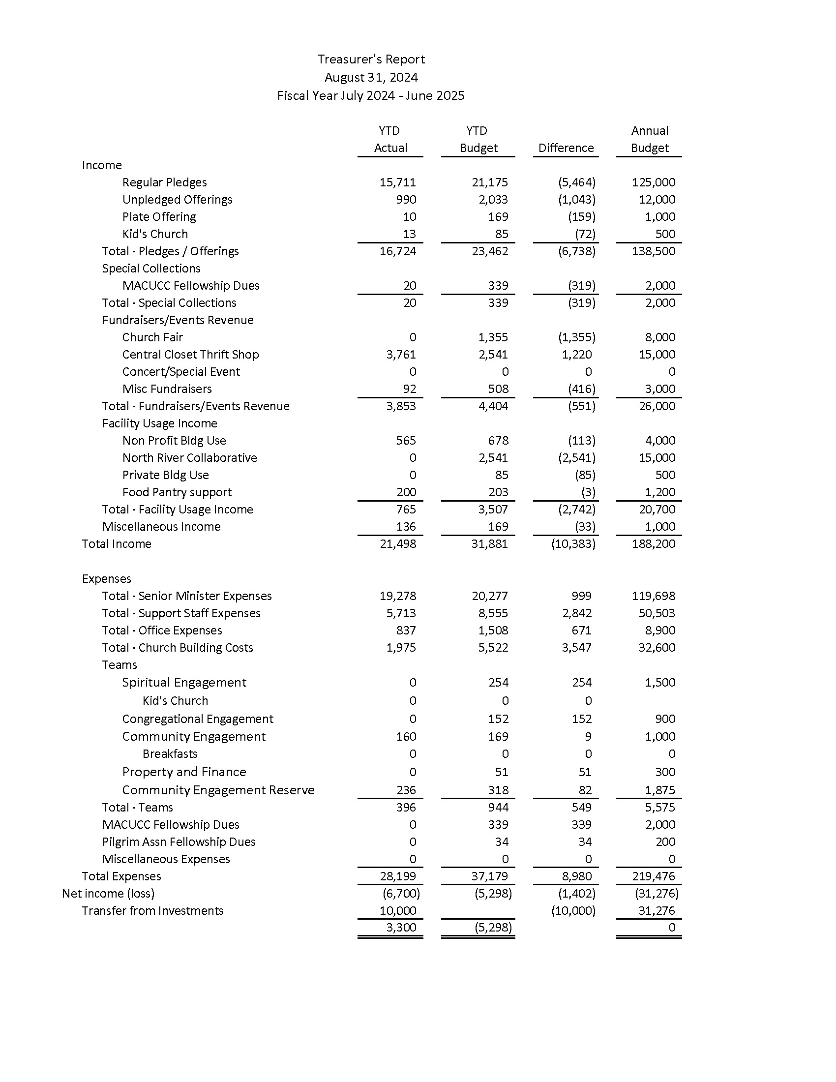 Treasurer’s Report – Rev Beth reviewed Dave’s report