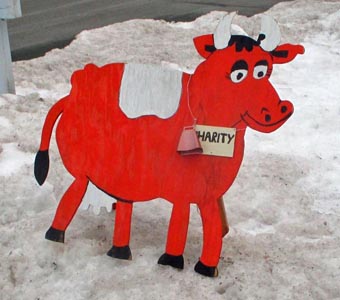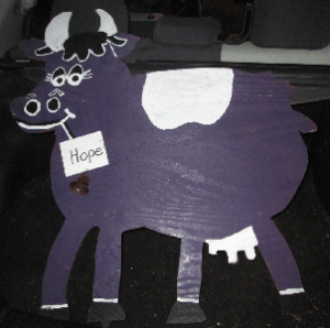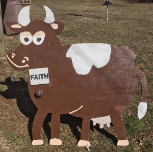 The first cow, Faith, was “born” with the carpentry skills of Rob Basler. Faith traveled alone for a while but soon was joined by Hope and Charity. To this day, nearly 30 years since Faith arrived, the three are moved from house to house, raising funds to feed the needs internationally, for about a month. The three cows this past winter managed to travel safely in the pandemic. However, one year all three were buried for a while due to a horrendous snowstorm.