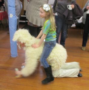 Bonus fun: a chicken brought by David Hanson once laid an egg during the festivities. David also has brought other animals from his farm, including a calf. And, Terry recalled, the Rev. Novotny raised goats at the parsonage on Union Street for donation to the Heifer Project.
