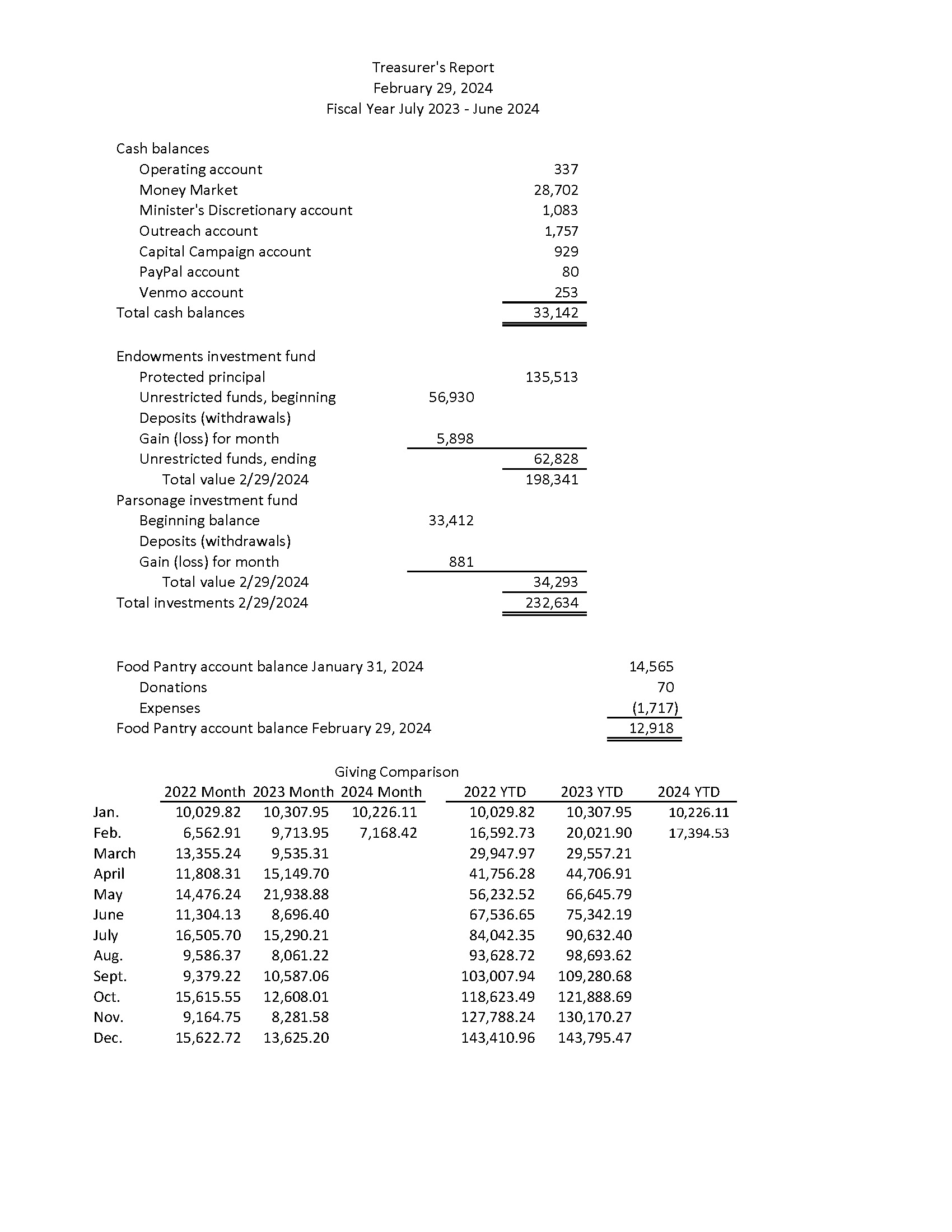 Last month’s giving was less than the same month last year, but this month’s is already ahead of last year. $30,000 this fiscal year has been taken out of investments, but luckily the stock market is doing well.